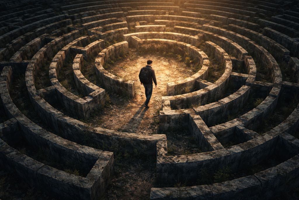 Uma coisa meio desconfortável: muita gente passa anos dizendo que quer mudar de vida, mas continua exatamente no mesmo lugar, como se estivesse em um labirinto…